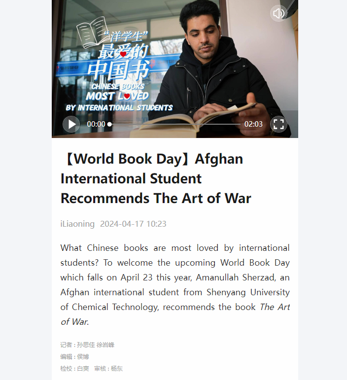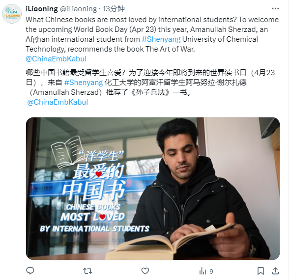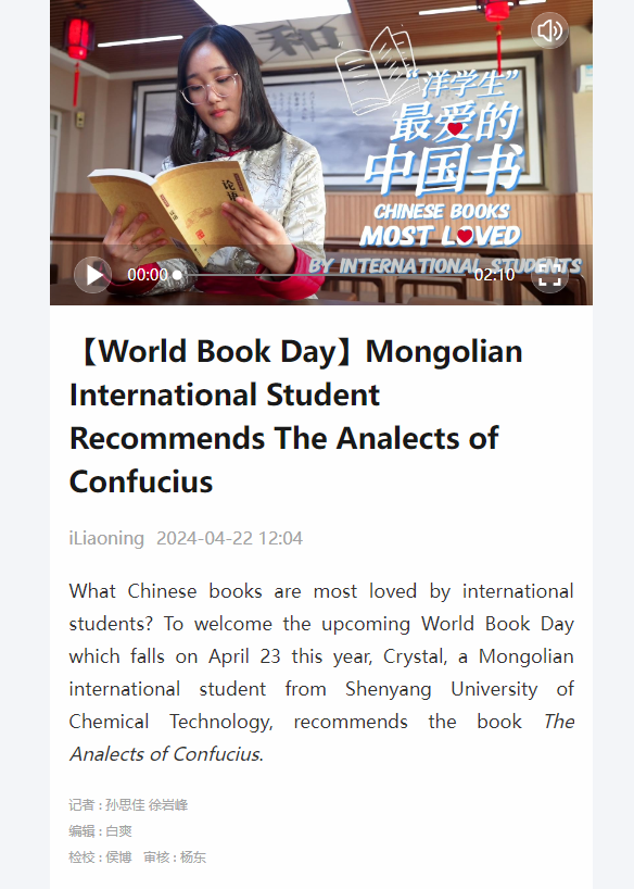 在世界读书日来临之际,taptap留学生史泽城、水晶参加我最喜欢的中国书推荐活动在辽望客户端、辽宁国际传播中心海外平台Facebook、Twitte等媒体上发布。