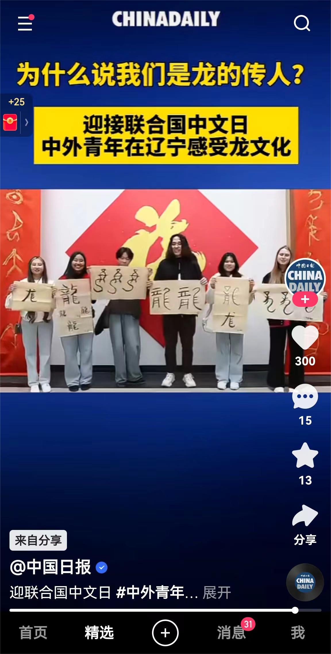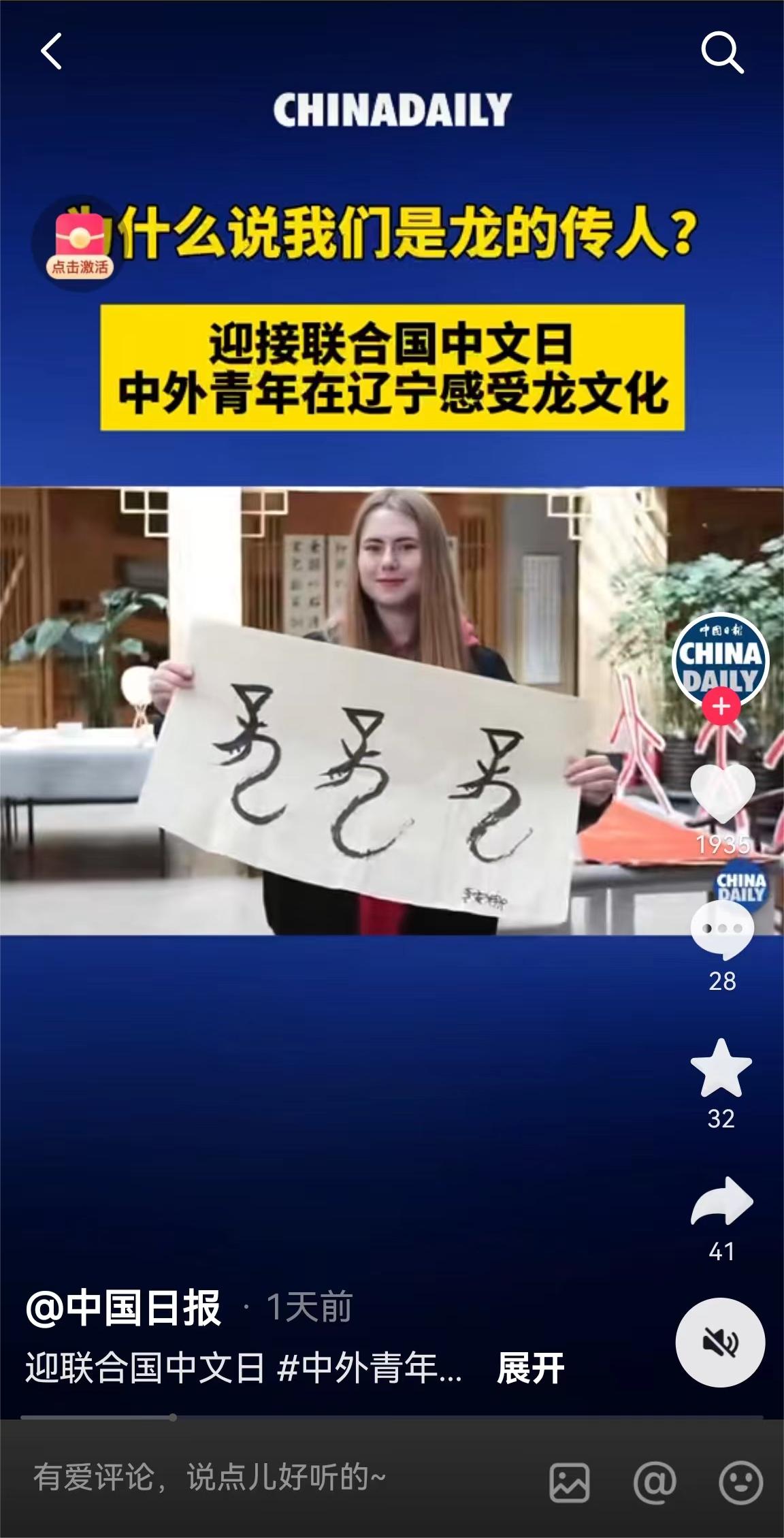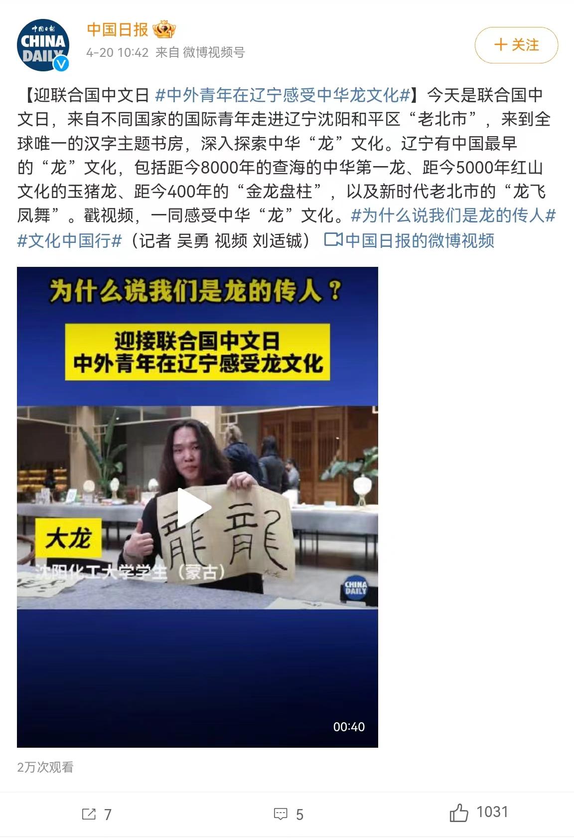 在第15个联合国中文日到来之际,taptap6名留学生宏伟(蒙古)、大龙(蒙古)、小音(蒙古)、李安娜(俄罗斯)、梅丽(吉尔吉斯斯坦)、白琳(泰国)走进辽宁沈阳和平区“老北市”,来到全球唯一的汉字主题书房,深入探索中华“龙”文化。活动报道在中国日报英文版及海内外各大媒体平台上发布,包括中国日报官方微信视频号、官方微博、抖音、快手、Facebook、Twitter、Instagram、LinkedIn、Youtube、Tiktok等,获得21世纪英文报官方视频号转载。