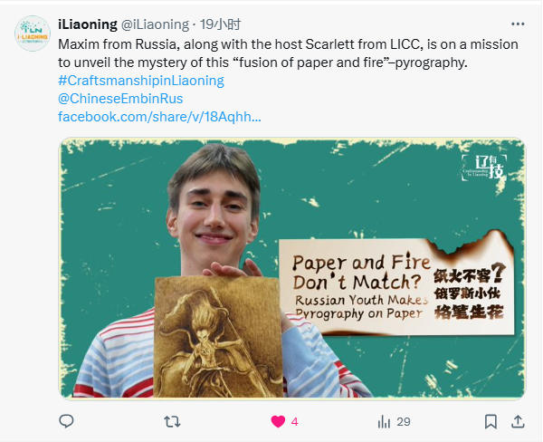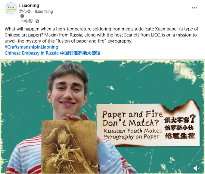 辽望客户端以《Paper and Fire Don’t Match? Russian Youth Makes Pyrography on Paper》(纸火不容?俄罗斯小伙“烙笔生花”)为题,对本次活动进行了报道,并同步发布于Facebook、Twitter等海外社交媒体平台,向世界展示中华优秀传统文化的独特魅力。
