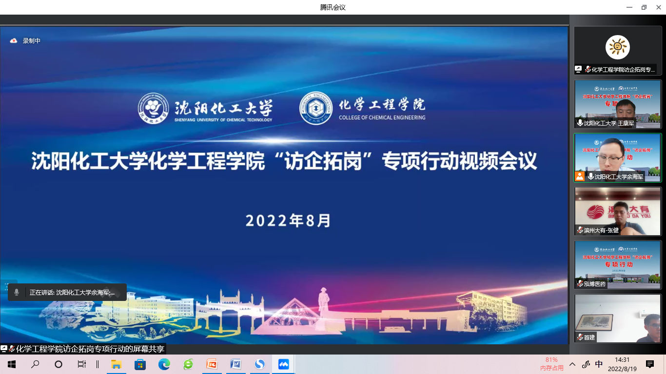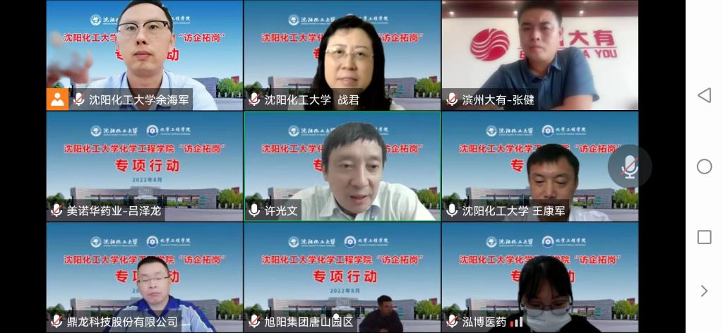 为贯彻落实党中央、国务院关于高校毕业生就业工作的决策部署,严格贯彻落实辽宁省教育厅有关“访企拓岗”的文件精神和taptap点点“访企拓岗”工作要求,加快健全毕业生市场化社会化的就业创业工作机制,开拓更多就业创业岗位和机会,8月19日,化学工程学院举办首次云端“访企拓岗”专项行动对接会。旭阳集团有限公司、首建农业集团有限公司、卫星化学股份有限公司、凯莱英医药化学技术有限公司、山东昌邑家园化工有限公司、宁波美诺华药业股份有限公司等20余家大型化工类企业代表参加了这次专项行动对接会。