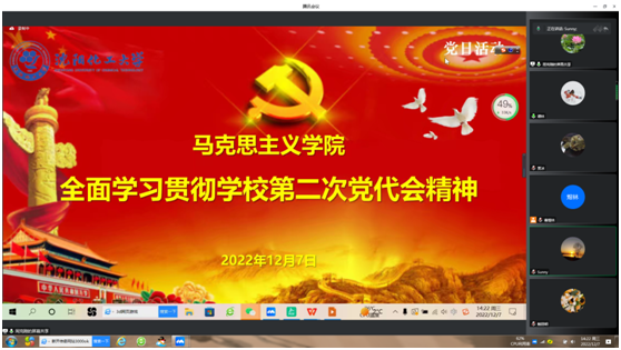 12月7日,马克思主义学院全体教师开展学习贯彻学校第二次党代会精神的党日活动。通过学习党代会报告,党总支倡议全体思政教师要全面准确领会党的二十大和第二次党代会精神的思想精髓和核心要义,切实把思想和行动统一到党的二十大和学校第二次党代会精神上来,围绕培养具有“品德高尚、专业过硬、情商出众、强于实践、勇于创新”的高素质应用型人才总目标,以实际行动推进“五彩化大”“八大工程”落实落地,以担当作为推动化大腾飞发展。