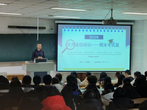 会上,刘满福副院长从培训目的、学术诚信的含义、不诚信考试的后果以及学术诚信的规范等四个方面做了详细的讲解,并结合实际案例,就考试中哪些行为属于作弊行为作了详细说明,以此警示全体同学要自觉遵守考试纪律,坚决做到诚信考试,杜绝考试作弊行为发生。随后,辅导员王怀就考风考纪问题作了补充说明,他要求同学们要严格遵守考场纪律,做好期末复习,以饱满的精神状态考出理想成绩。此外,他提醒全体同学们在做好期末复习的同时,务必要筑牢安全防线,增强防火、防盗意识,遵守控烟管理以及宿舍管理规定,提高反诈能力,做好日常出行报备等安全教育工作。