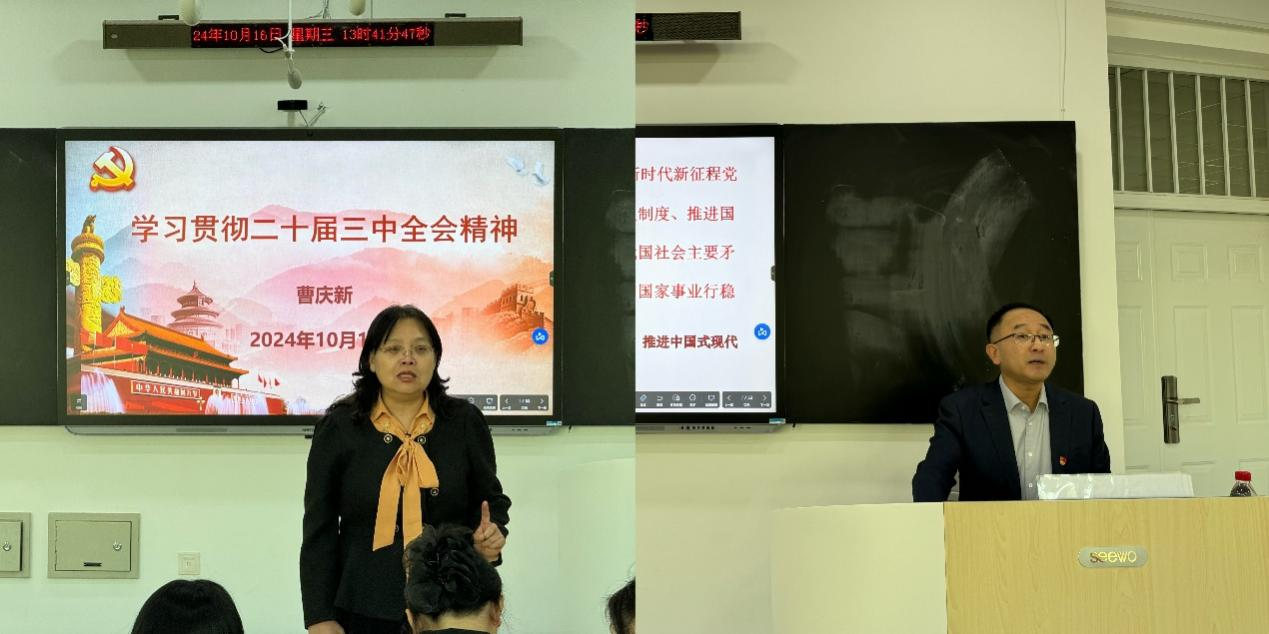 为深入学习宣传贯彻党的二十届三中全会精神,深刻领会全会的重大意义,准确把握全会的精神实质,10月16日,教辅党总支在通明楼236教室组织召开了党的二十届三中全会精神宣讲会。会议邀请校宣讲团成员、马克思主义学院教师曹庆新作专题宣讲报告,教辅党总支全体教职工参会。