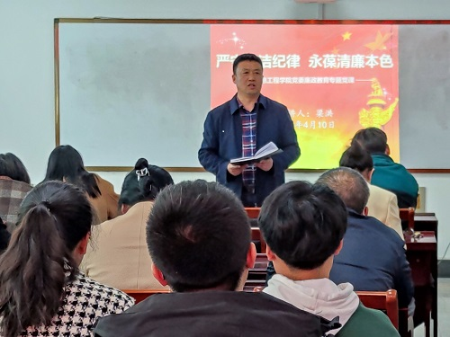 学院党委书记梁洪运用丰富深刻的党史知识,结合具体的廉政警示案例,结合身边人、身边事,点面结合,全面清晰地讲述了学习贯彻习近平总书记关于党的自我革命的重要思想的重大意义、丰富内涵和实践要求,对新修订的《中国共产党纪律处分条例》进行了学习解读并就工作落实提出了具体要求。