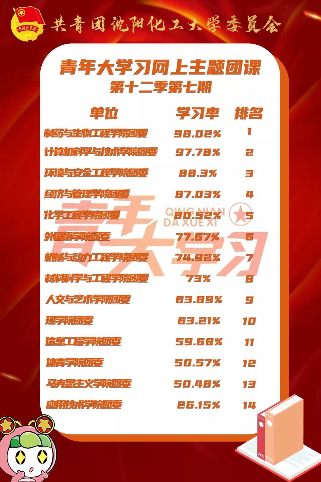 在本期青年大学习网上主题团课中,制药与生物工程学院团委、计算机科学与技术学院团委、环境与安全工程学院团委(化工安全与应急管理产业学院)的学习率位列前三甲,制药与生物工程学院团委学习率高达98.02%,排名第一。