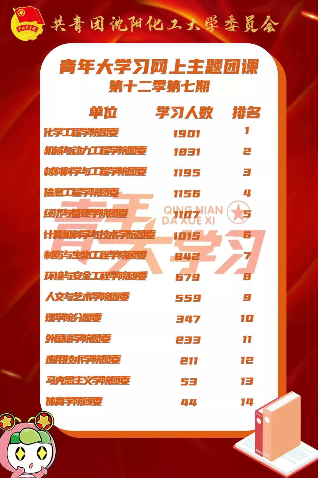学习人数排名中,化学工程学院团委的团员学习人数达1901人,位列榜首;机械与动力工程学院团委的团员学习人数达1831人,位列第二名;材料科学与工程学院分团委的团员学习人数达1195人,位列第三名。