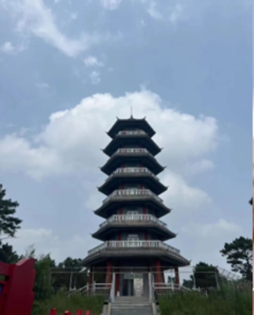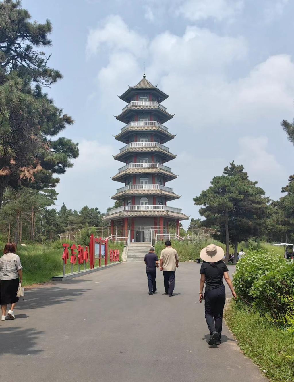 林子深处,有一塔矗立,其名为瞭望塔。成员们怀着好奇心登上了瞭望塔,塔有七层,楼梯陡峭,大家小心翼翼地登上塔顶,终于眺望到了万亩松林。队员们被眼前的景观深深震撼,不禁产生“会当凌绝顶,一览众山小”的感觉,切实感受到先辈们植树治沙的决心与坚守。