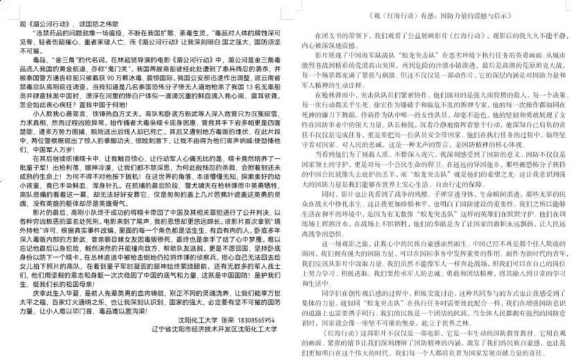 同学在观影后以“国防教育”为主题进行电影观后感创作。活动旨在增强同学的国防意识和国防精神,在创作过程中,同学们共同参与,共同承担责任,激发了民族自豪感和集体荣誉感,增强了全民族的团结意识,为国家的长远发展提供了坚实的基础。