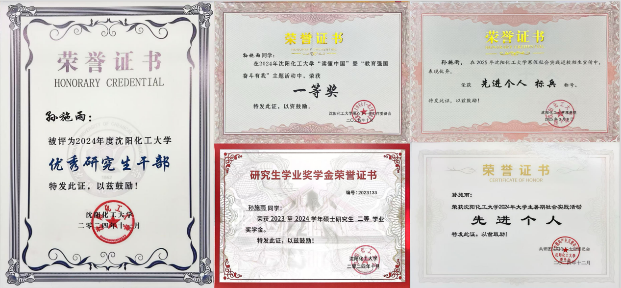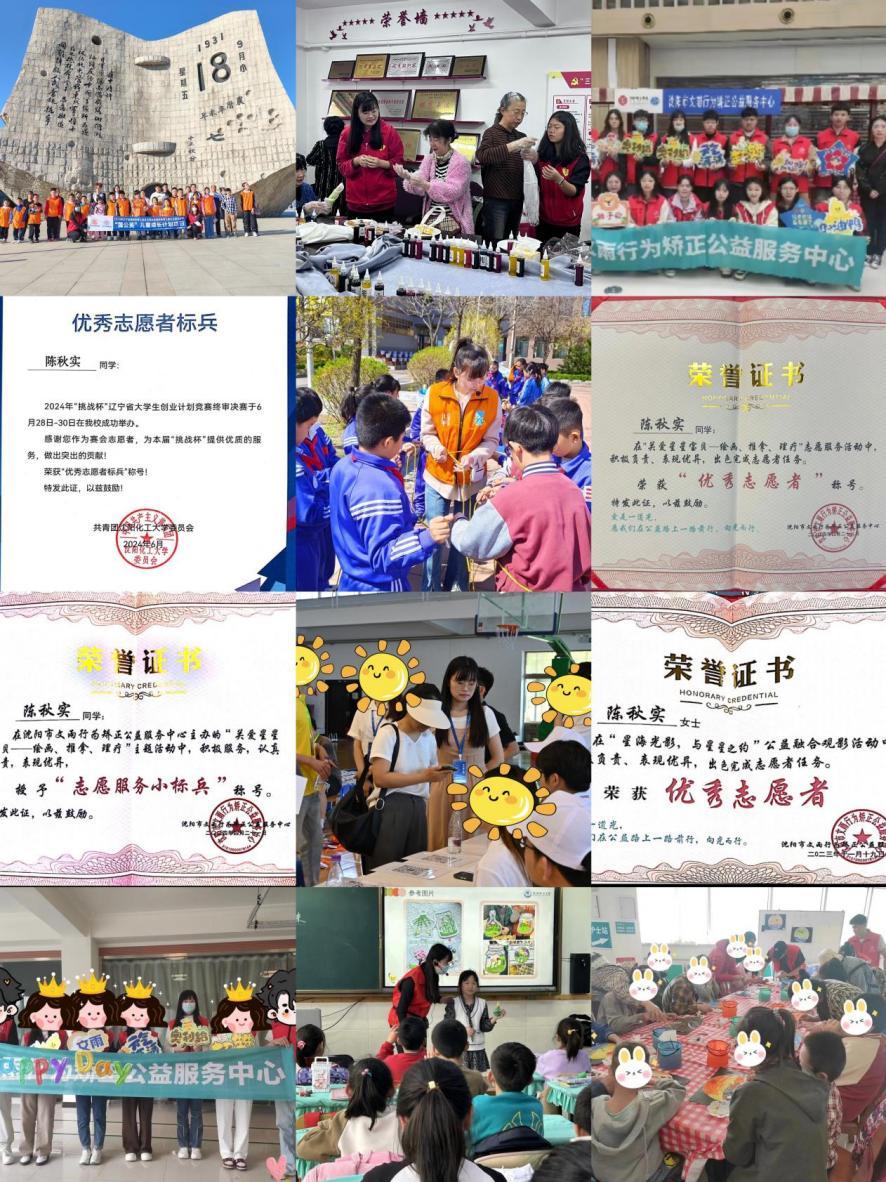 2023年她主动投身于“大青小学支教”“红领巾心向党云支教”等教育帮扶项目。在支教过程中,她充分发挥自己的专业优势,用一个个生动有趣的化学实验,带领小朋友们敲开化学魔法世界的大门。2024年雷锋纪念日期间,她走进大青街道创新社区,化身“环境守护者”;在百人体操比赛中,她活力四射,尽情展现青春风采;在沈阳市“大安全短视频大赛”中,凭借出色的表现荣获优秀奖;组织参加2024年taptap点点“读懂中国”暨“教育强国”活动,作品《师者如光,微以致远》荣获校一等奖。