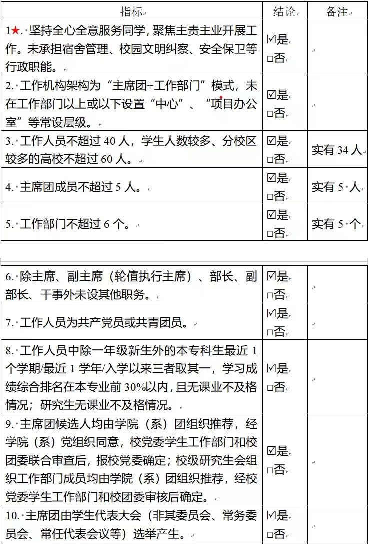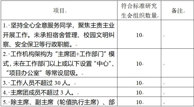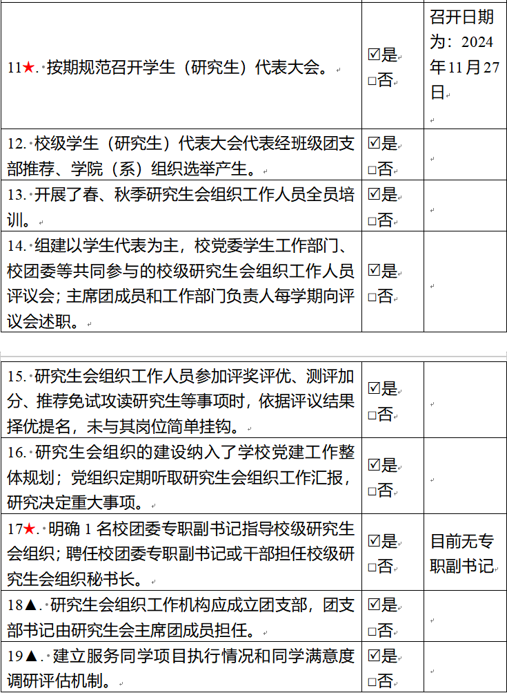 为落实共青团中央、教育部、全国学联联合下发的《关于推动高校学生会(研究生会)深化改革的若干意见》,并结合《关于巩固高校学生会(研究生会)改革成果的若干措施》文件要求,接受广大师生监督,现将taptap2024—2025学年研究生会改革情况公开如下。一、改革自评表(一)校级研究生会组织改革自评表标注“★”为核心指标;标注“▲”为观测指标,2024—2025学年暂不作硬性要求。