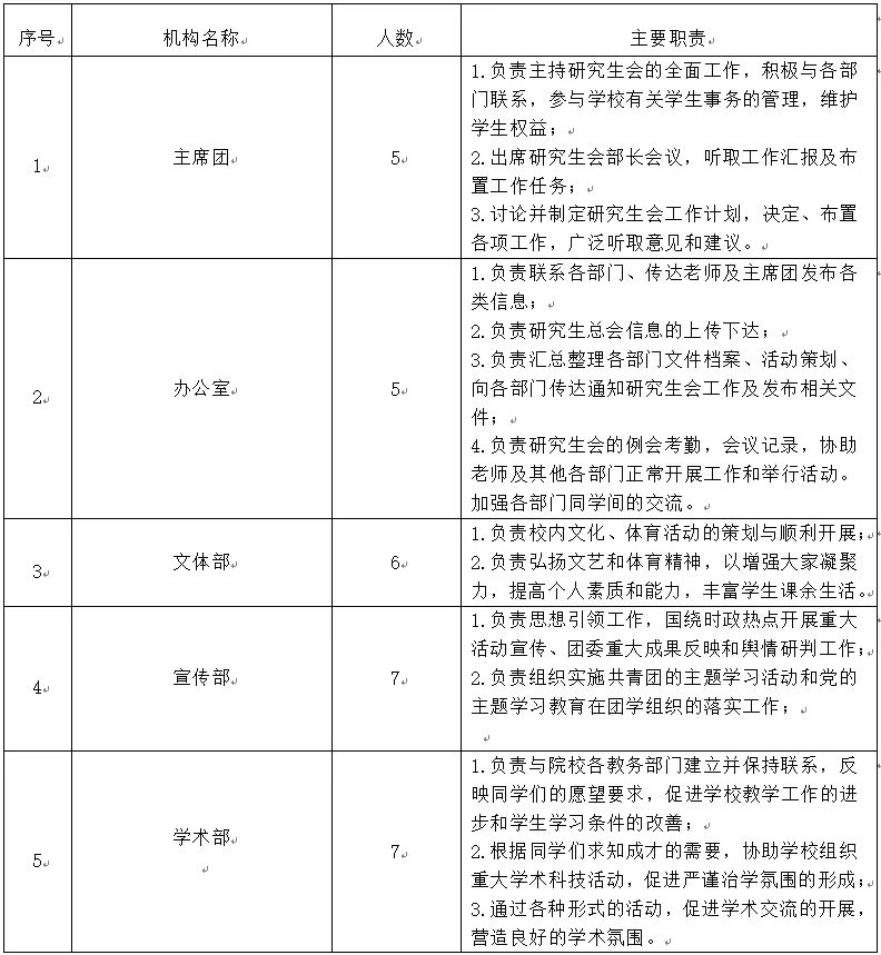 第四章 执行机构第十三条 研究生会组织架构为“主席团+工作部门”模式。主席团成员不超过5人;工作部门一般不超过6个,每个工作部门成员设负责人1至2人,工作人员一般不超过6人。研究生会工作人员一般为40人左右。第十四条 研究生会主席团集体负责学生会重大事项,设执行主席,执行主席由主席团成员轮值担任,以学期为一个轮值周期,执行主席负责召集会议、牵头日常工作。第十五条 研究生会主席团的职责:主持研究生会的全面工作;负责召集研究生会委员会会议及主席团会议;代表研究生会向研究生代表大会作工作报告;对研究生会负责并受其监督;定期向校党委汇报研究生会工作情况。第十六条 研究生会各工作部门必须依照研究生会的统一安排及各工作部门自身的工作特点,制定本部门的工作计划,经费预算等。第十七条 遵循健全组织、完善功能、发挥作用、精简高效和符合学生组织特点的原则,按照扁平化方式设置职能部门,减少管理层级,提升管理效能。