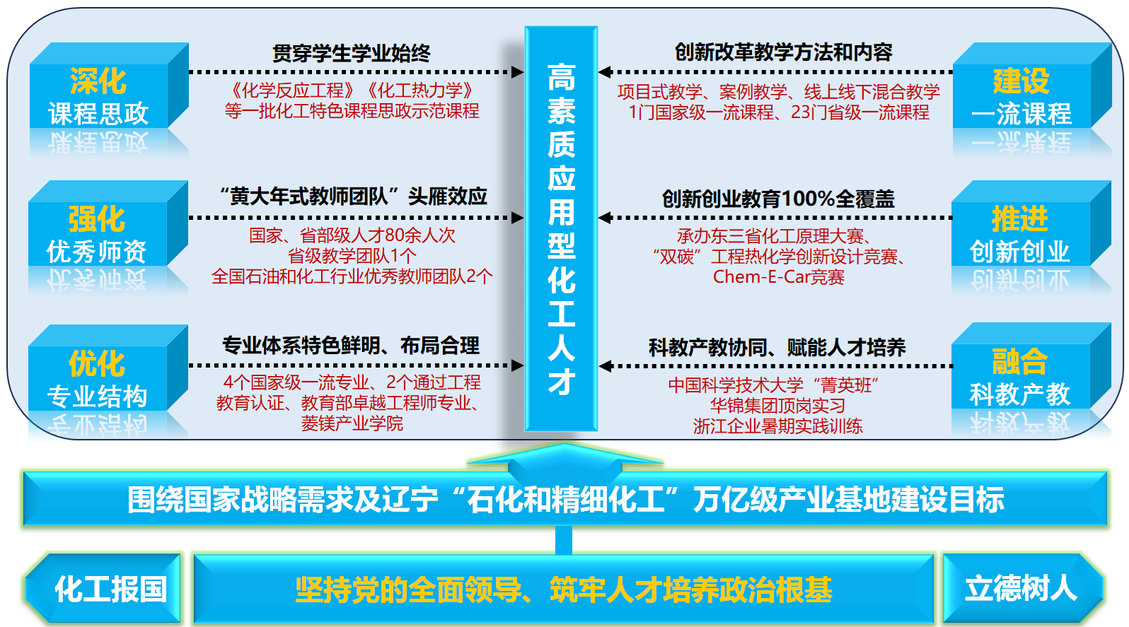 化学工程学院始终坚持以习近平新时代中国特色社会主义思想为指引,全面贯彻党的教育方针,落实立德树人根本任务,紧紧围绕国家战略需求及辽宁“石化和精细化工”万亿级产业基地建设目标,以高质量发展为核心,深化教育教学改革,推进人才培养供给侧结构性改革,不断提升办学水平和人才培养质量。